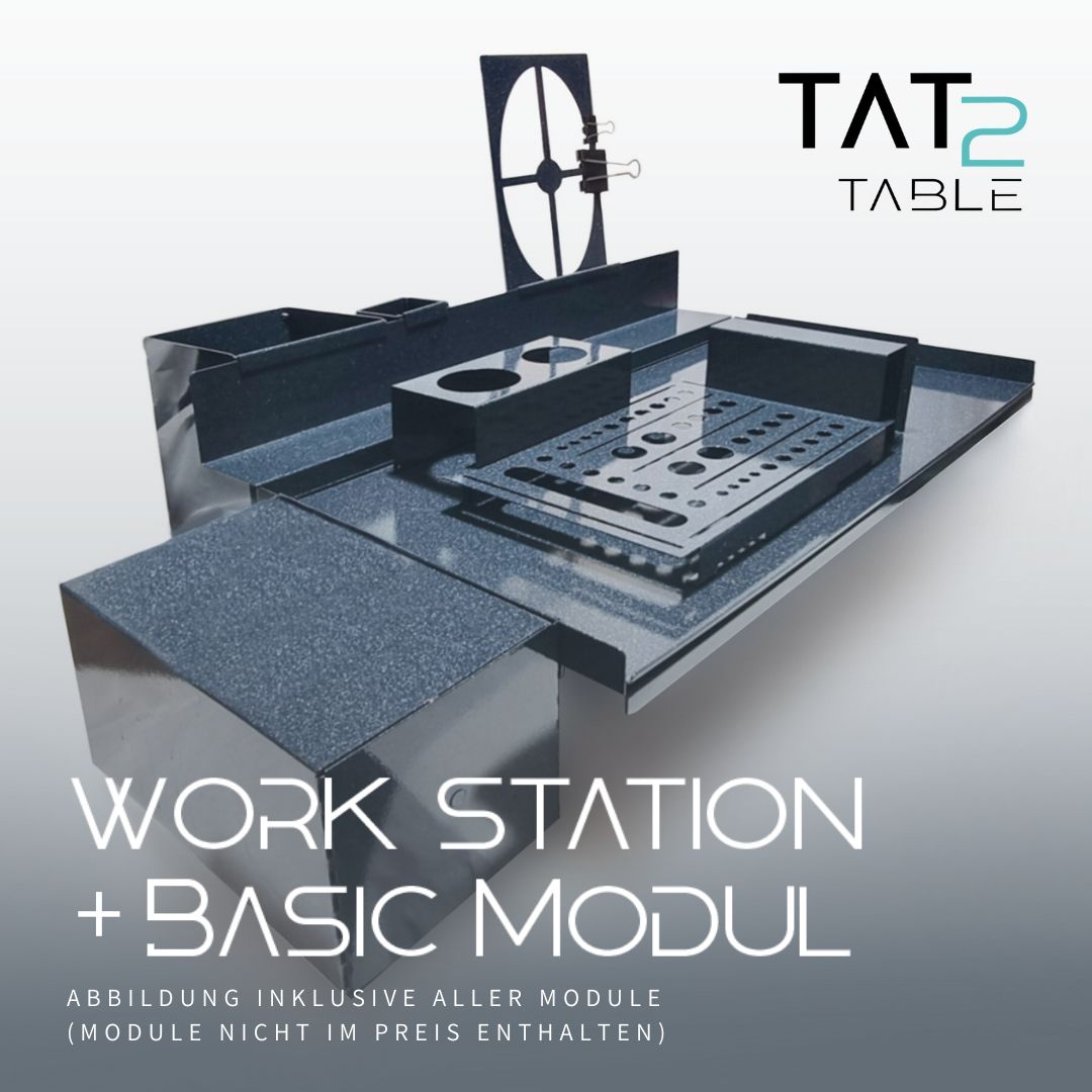 Erleben Sie ultimative Organisation und Langlebigkeit mit unserem Tat2table Basic Modul – dem unverzichtbaren Begleiter für jeden Tätowierer, der Wert auf Qualität und Funktionalität legt. Inklusive Abdeckplatten, Tuchspender und Becherhalter.